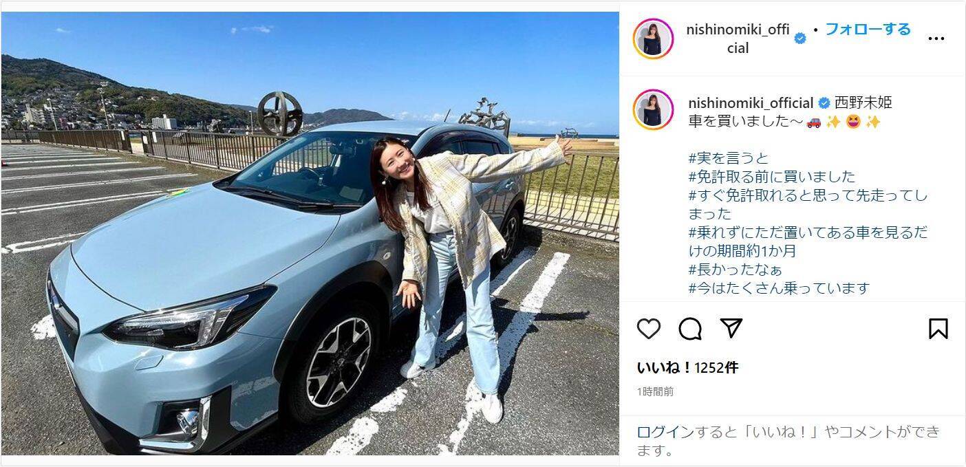元AKB48でタレントの西野未姫が5日(水)、自身のインスタグラムを更新。購入した車を公開した。