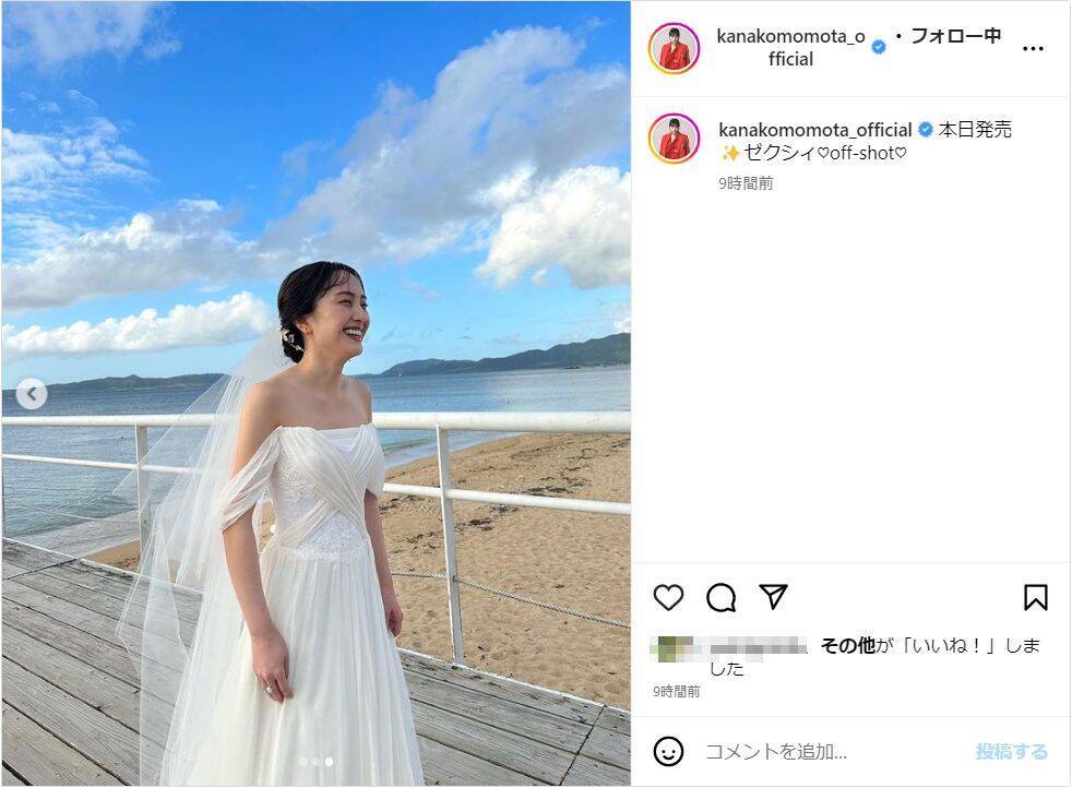 百田は「本日発売 ゼクシィ off-shot」とつづり、写真を投稿。純白のウェディングドレスを着用し、海の近くで撮影したオフショットを披露した。
