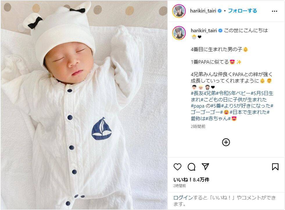 平は「この世にこんにちは 4番目に生まれた男の子 1番PAPAに似てる」と記し、すやすやと眠る赤ちゃんの写真を投稿。続けて「4兄弟みんな仲良くPAPAとの絆が強く成長していってくれますように」とつづった。