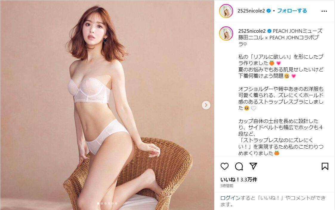 藤田は「PEACH JOHNミューズ 藤田ニコル × PEACH JOHNコラボブラ 私の『リアルに欲しい』を形にしたブラ作りました」と報告し、写真を投稿。同ブランドの白のランジェリーを身に着け、圧巻の美ボディショットを披露し、「夏のお悩みでもある肌見せしたいけど下着何着けよう問題 オフショルダーや背中あきのお洋服も可愛く着られる、ズレにくくホールド感のあるストラップレスブラにしました」などアイテムの説明をつづった。