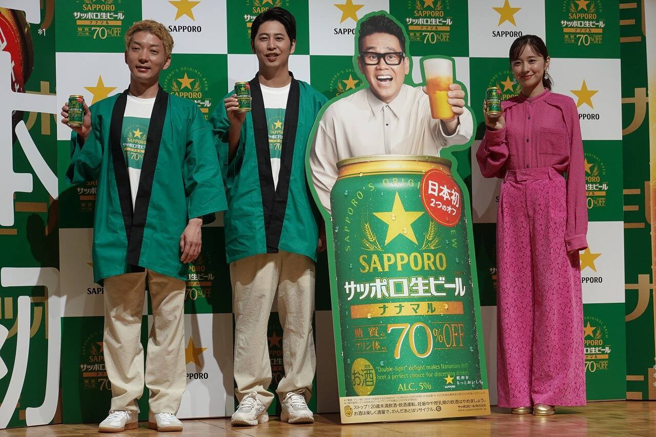 日本初、糖質・プリン体70%オフの生ビールを実現した「サッポロ生ビール ナナマル」新CM発表会が同社で10月16日(月)に開催され、新ブランドキャラクターを務める俳優の堀田真由、その応援隊としてお笑い芸人ニューヨークの嶋佐和也・屋敷裕政が出席した。