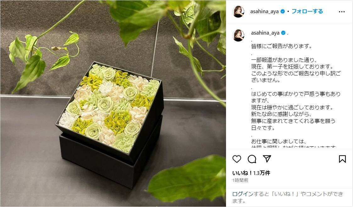 朝比奈は「皆様にご報告があります。一部報道がありました通り、現在、第一子を妊娠しております。このような形でのご報告なり申し訳ございません。」と報告し、フラワーボックスの写真を投稿。続けて「はじめての事ばかりで戸惑う事もありますが、現在は穏やかに過ごしております。新たな命に感謝しながら、無事に産まれてきてくれる事を願う日々です。」と伝え、「お仕事に関しましては、体調と相談しながら続けていきます。温かく見守って頂けると幸いです そして今後とも応援のほどよろしくお願い致します!」と呼びかけた。