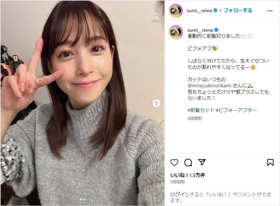 鷲見は「衝動的に前髪切りました」と報告し、カット前後のビフォーアフター写真を投稿。「しばらく分けてたから、生えぐせついたのか割れやすくなってるー」とイメチェンした新ヘアでピースサインをする姿を披露し、「カットはいつもの @mineyukimorikami さんに 色もちょっとだけツヤ感プラスしてもらいました!」とつづった。