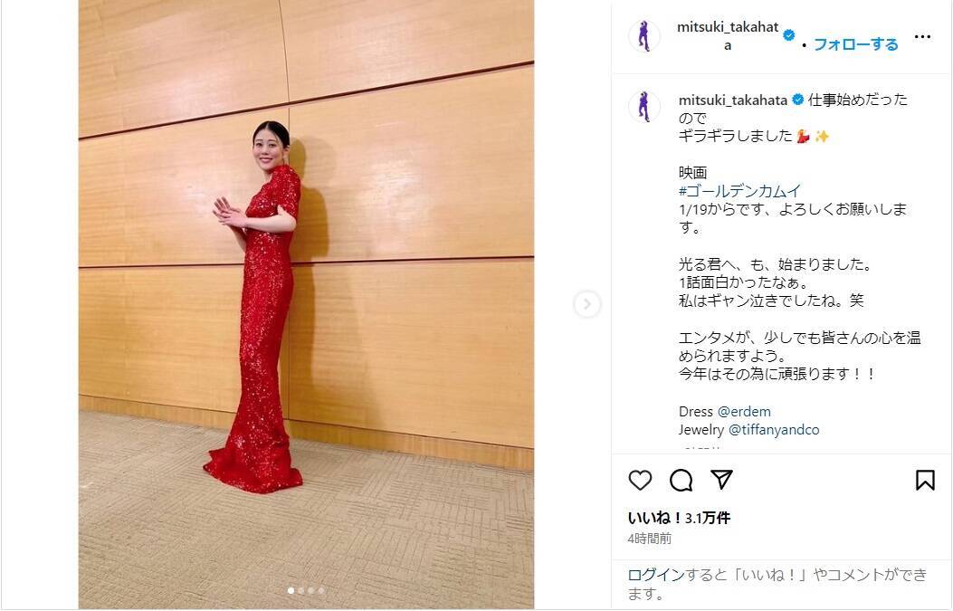 高畑は「仕事始めだったのでギラギラしました」と記し、写真を投稿。ギラギラと輝くゴージャスな赤ロングドレス姿を披露し、「映画 #ゴールデンカムイ 1/19からです、よろしくお願いします。光る君へ、も、始まりました。1話面白かったなぁ。私はギャン泣きでしたね。笑」「エンタメが、少しでも皆さんの心を温められますよう。今年はその為に頑張ります!!」と意気込みをつづった。