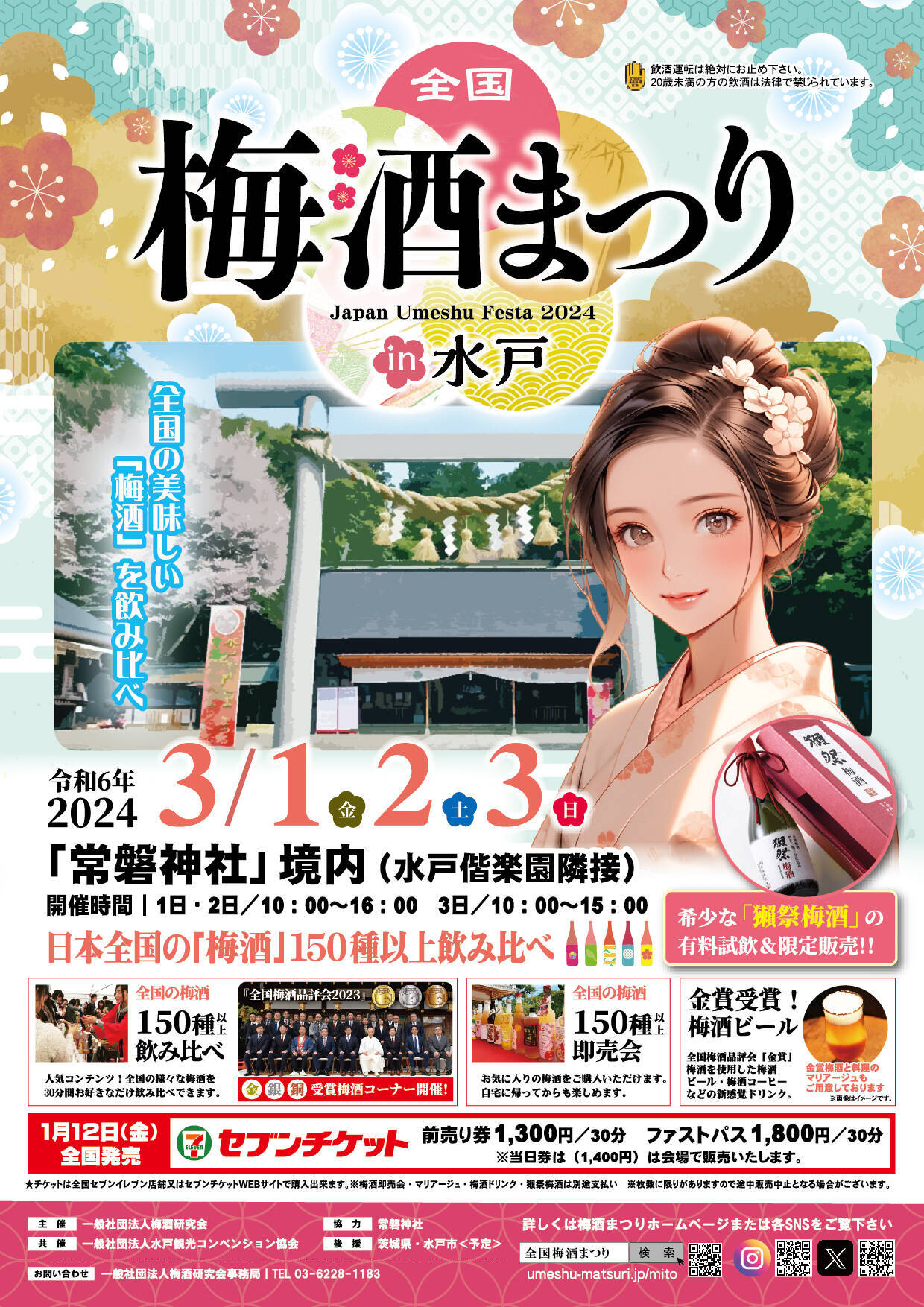 「全国梅酒まつりin水戸2024」が、2024年3月1日(金)から3日(日)の3日間、茨城県水戸市の常磐神社で開催される。