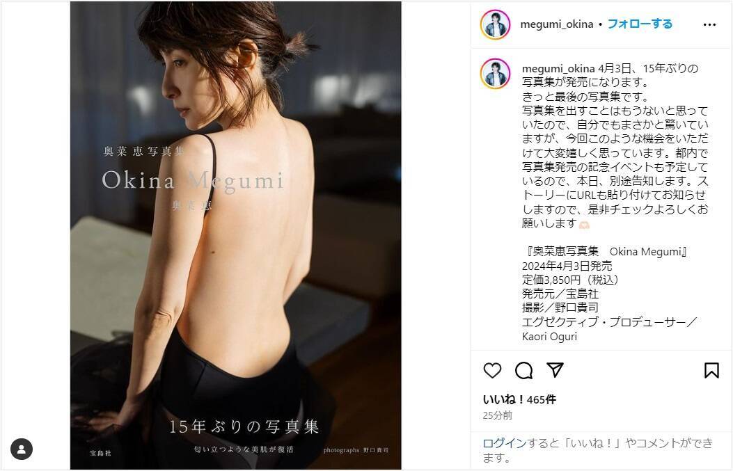 奥菜は「4月3日、15年ぶりの写真集が発売になります。きっと最後の写真集です。」と報告し、美しい背中ショットの写真集のカットを投稿。続けて「写真集を出すことはもうないと思っていたので、自分でもまさかと驚いていますが、今回このような機会をいただけて大変嬉しく思っています。」と心境をつづり、「都内で写真集発売の記念イベントも予定しているので、本日、別途告知します。ストーリーにURLも貼り付けてお知らせしますので、是非チェックよろしくお願いします」と呼びかけた。