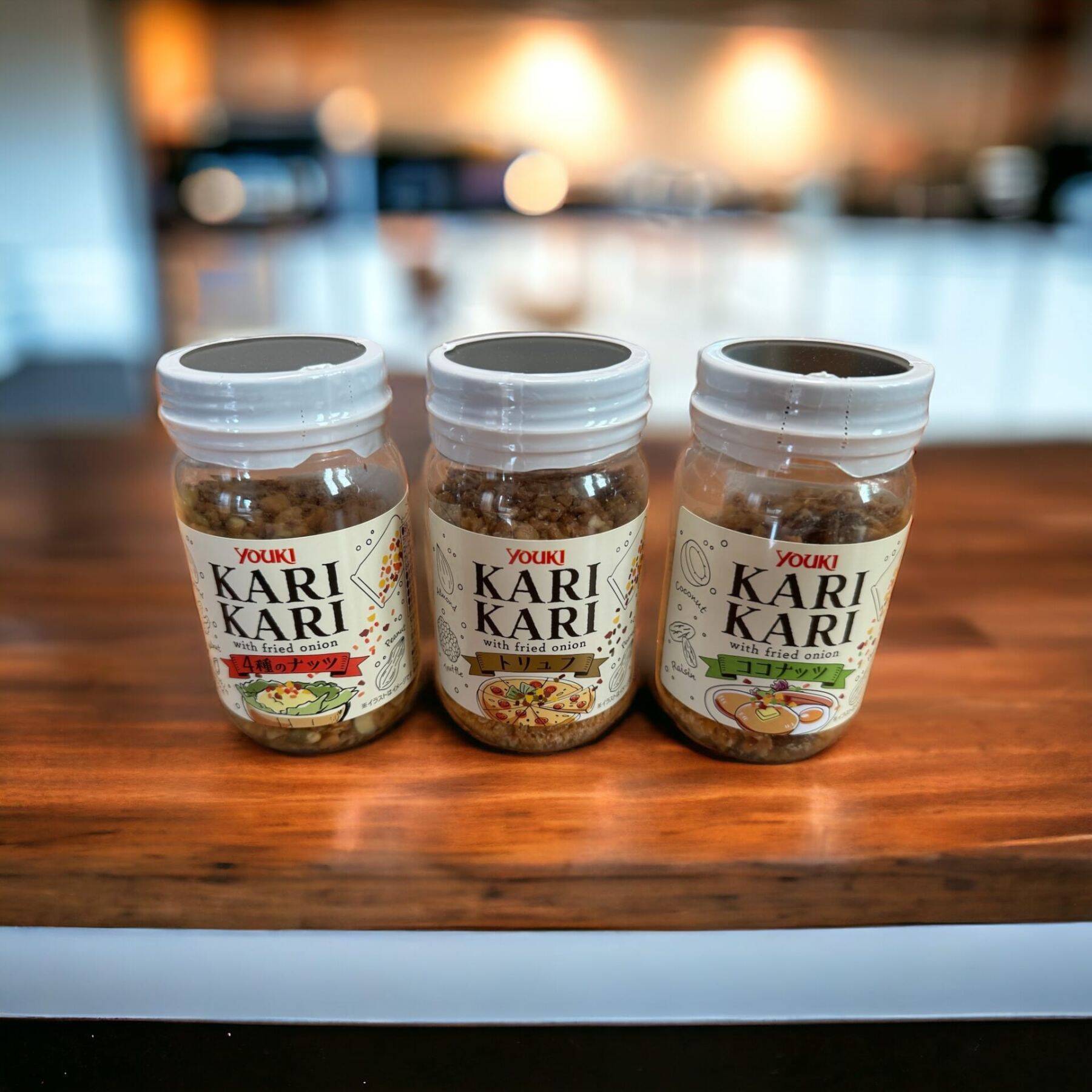 今回そんな「フライドオニオン」のトッピング用調味料 ユウキ「KARIKARIカリカリ」シリーズが3 月1日に新発売された。最高のカリカリ食感と美味しさを共に味わえるとの事で、「4種のナッツ」「トリュフ」「ココナッツ」の全3種類を提供頂けたので、実際に我が家の料理に使ってみたのでレポートしよう。