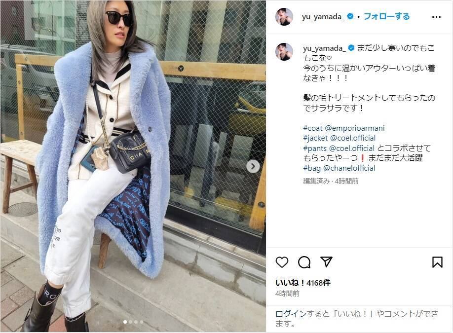 山田は「まだ少し寒いのでもこもこを 今のうちに温かいアウターいっぱい着なきゃ!!!」と記し、写真を投稿。サングラス姿に暖かそうなもこもこのコートを羽織り、上下白をメインにした服に、黒の靴とバッグを合わせた私服姿を披露し、「髪の毛トリートメントしてもらったのでサラサラです!」とつづった。