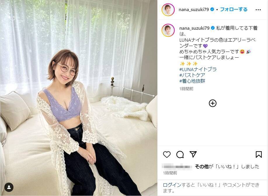 鈴木は「私が着用してる下着は、LUNAナイトブラの色はエアリーラベンダーです めちゃめちゃ人気カラーです 一緒にバストケアしましょー」とつづり、写真を投稿。メガネをかけてラベンダーカラーのナイトブラを着用し、ベッドに座る美ボディショットを披露した。