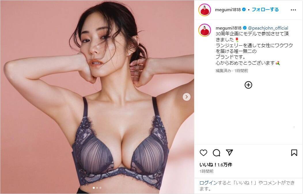 MEGUMIは「@peachjohn_official 30周年企画にモデルで参加させて頂きました」と報告。女性向け下着ブランド「ピーチ・ジョン」のランジェリーを着用し、圧巻の美ボディを披露。「ランジェリーを通して女性にワクワクを届ける唯一無二のブランドです。心からおめでとうございます」とつづった。