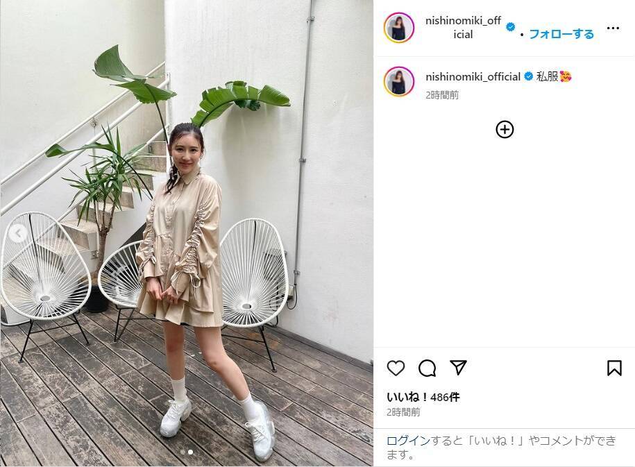 西野は「私服」とつづり、写真を投稿。ベージュのミニ丈のシャツワンピースに白のソックスとスニーカーを合わせ、スラリと伸びた美脚を披露した。
