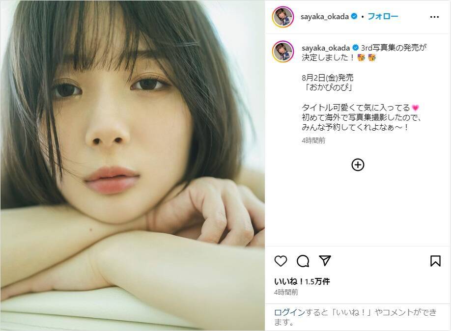 この投稿にファンからは、「発売決定おめでとう~」「楽しみです」「アンニュイな表情が素敵」「タイトルもですが、おかぴがとにかくカワイイ」「ぜひGETします」などのコメントが寄せられている。
