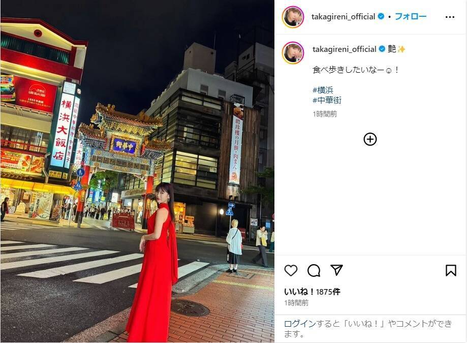 高城は「艶 食べ歩きしたいなー!」とつづり、写真を投稿。ノースリーブの真っ赤なロングドレスを着て、夜の中華街をバックに撮影したショットを披露した。