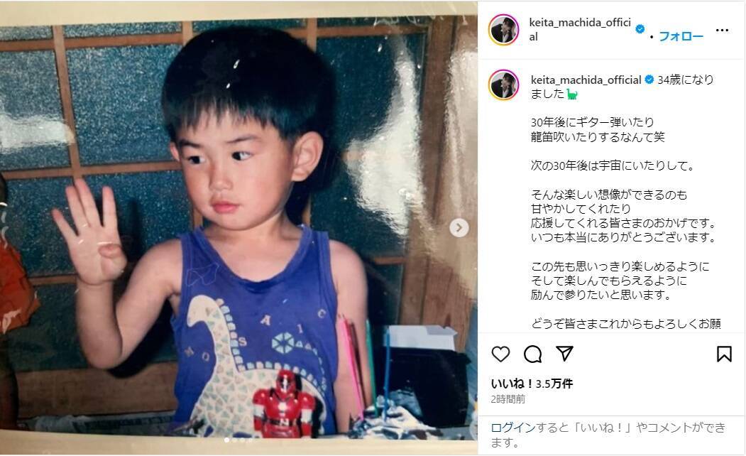町田は「34歳になりました」と報告し、幼少期の写真を投稿。「30年後にギター弾いたり龍笛吹いたりするなんて笑 次の30年後は宇宙にいたりして。そんな楽しい想像ができるのも甘やかしてくれたり応援してくれる皆さまのおかげです。いつも本当にありがとうございます。」と感謝をつづり、「この先も思いっきり楽しめるように そして楽しんでもらえるように励んで参りたいと思います。どうぞ皆さまこれからもよろしくお願いします!」と呼びかけた。