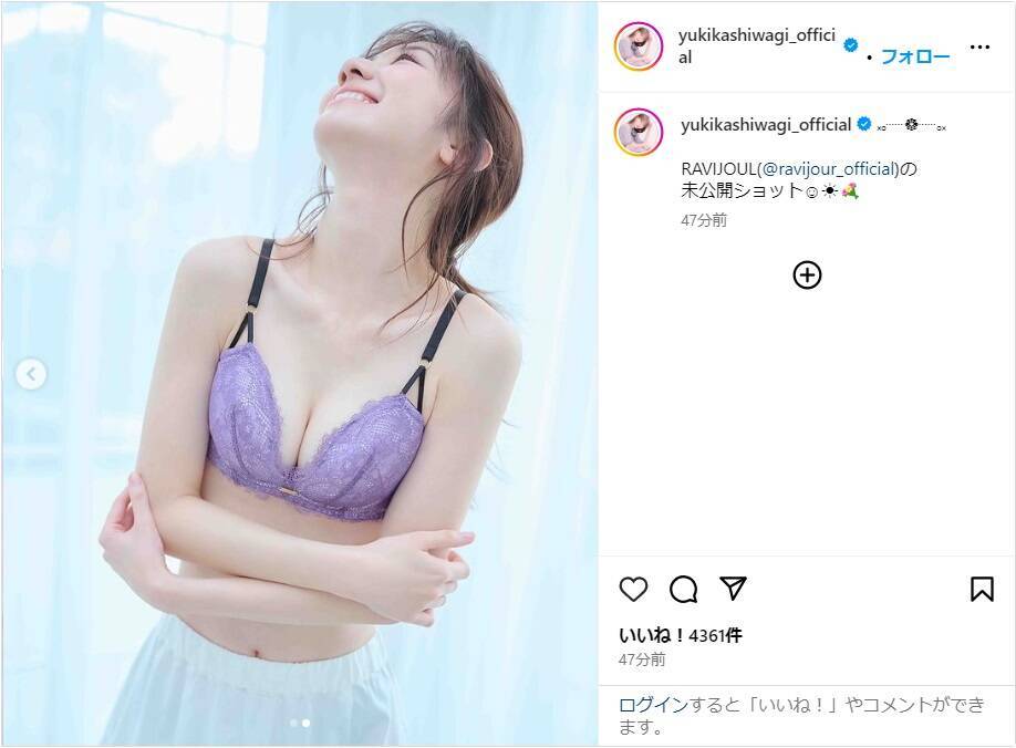 元AKB48の柏木由紀が4日(木)、自身のインスタグラムを更新。アンバサダーを務めるランジェリーブランドの未公開ショットを公開した。