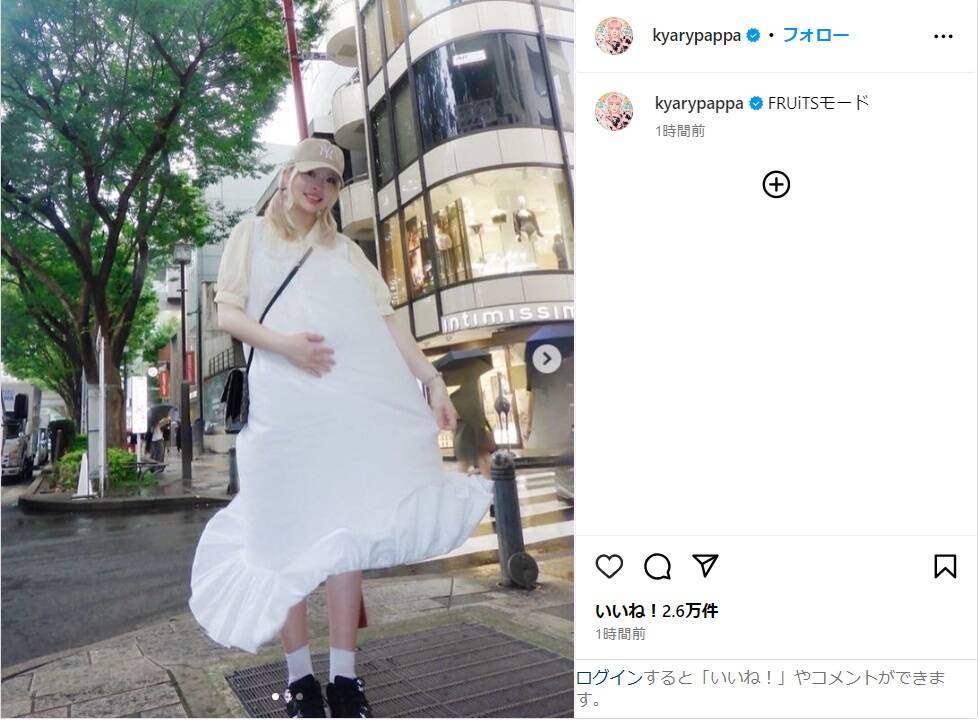 きゃりーは「FRUiTSモード」とつづり、妊娠中のお腹がふっくらした姿を披露。この日はキャップを被り、白のロングワンピースにスニーカーを合わせたコーデで、友人のモデル・益若つばさとのオフショットをアップした。