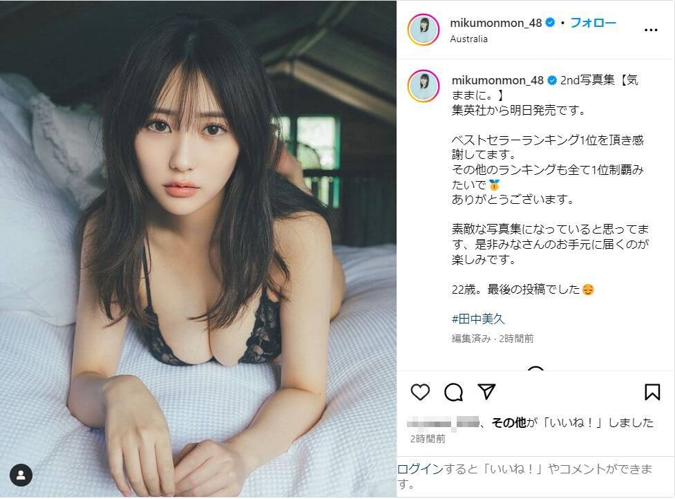 田中は「2nd写真集【気ままに。】集英社から明日発売です」と伝え、写真を投稿。「ベストセラーランキング1位を頂き感謝してます。その他のランキングも全て1位制覇みたいで ありがとうございます」と感謝し、「素敵な写真集になっていると思ってます、是非みなさんのお手元に届くのが楽しみです」と期待を寄せ、投稿では黒のランジェリー姿でベッドに横たわるショットを披露。最後に、誕生日前日ということで「22歳。最後の投稿でした」とつづった。