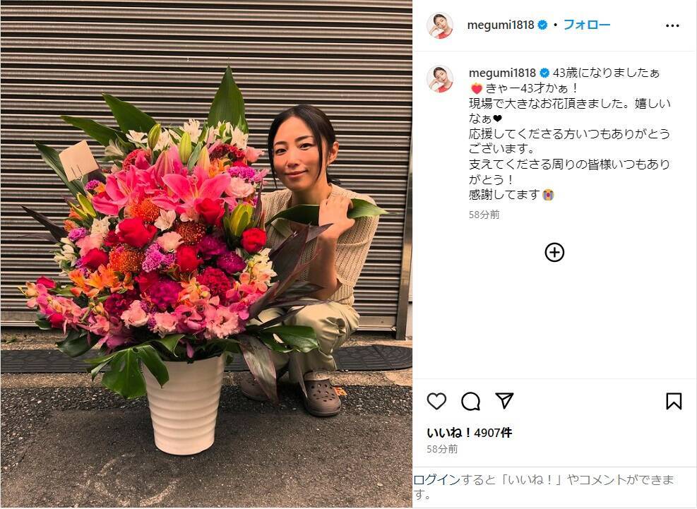 MEGUMIは「43歳になりましたぁ きゃー43才かぁ!現場で大きなお花頂きました。嬉しいなぁ」と報告。お祝いの花と撮影した写真を披露し、「応援してくださる方いつもありがとうございます。支えてくださる周りの皆様いつもありがとう!感謝してます」と感謝をつづった。