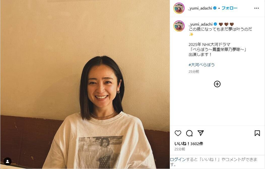女優の安達祐実がが27日(金)、自身のインスタグラムを更新。2025年放送の大河ドラマ『べらぼう ~ 蔦重栄華乃夢噺 (つたじゅうえいがのゆめばなし)~』に出演することを報告した。