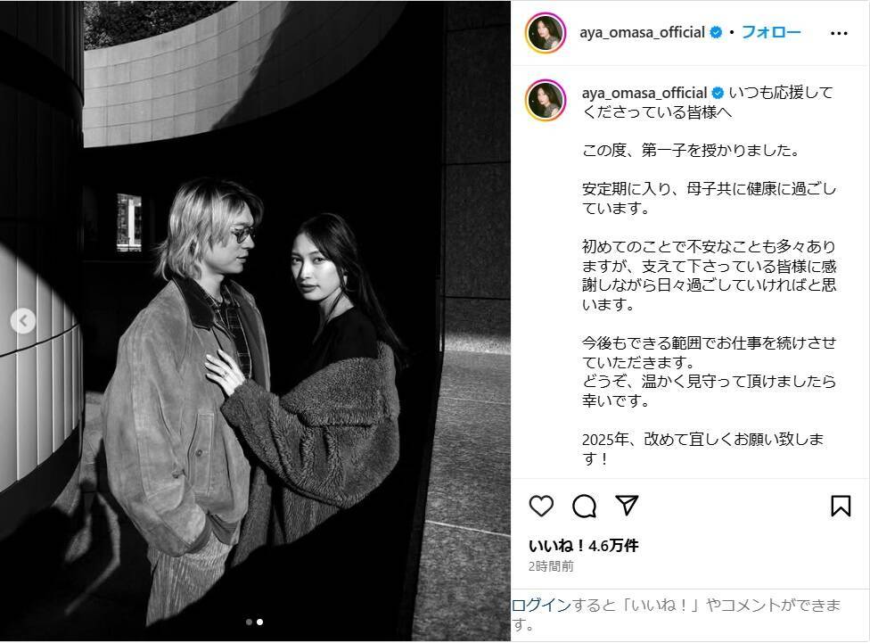大政は「この度、第一子を授かりました。安定期に入り、母子共に健康に過ごしています」と報告。「初めてのことで不安なことも多々ありますが、支えて下さっている皆様に感謝しながら日々過ごしていければと思います」と伝え、「今後もできる範囲でお仕事を続けさせていただきます。どうぞ、温かく見守って頂けましたら幸いです。2025年、改めて宜しくお願い致します!」と呼びかけた。
