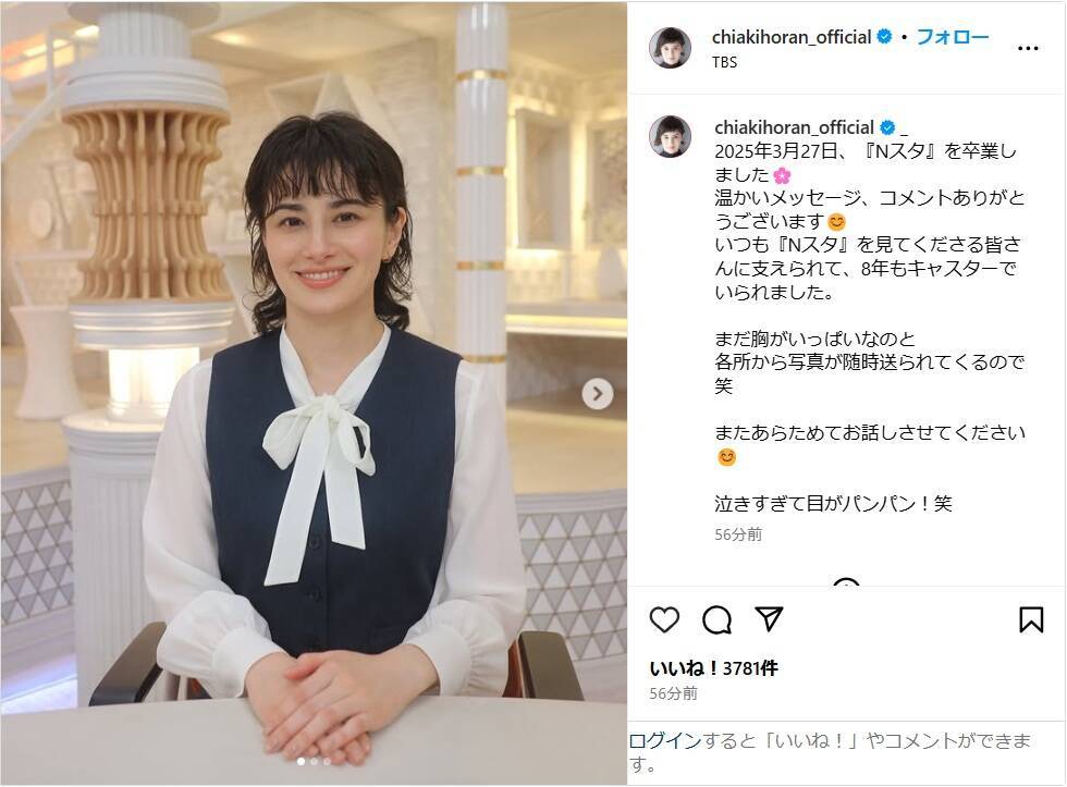 タレントのホラン千秋が28日、自身のインスタグラムを更新。キャスターを務めてきたTBS系情報番組『Nスタ』を卒業したことを報告した。