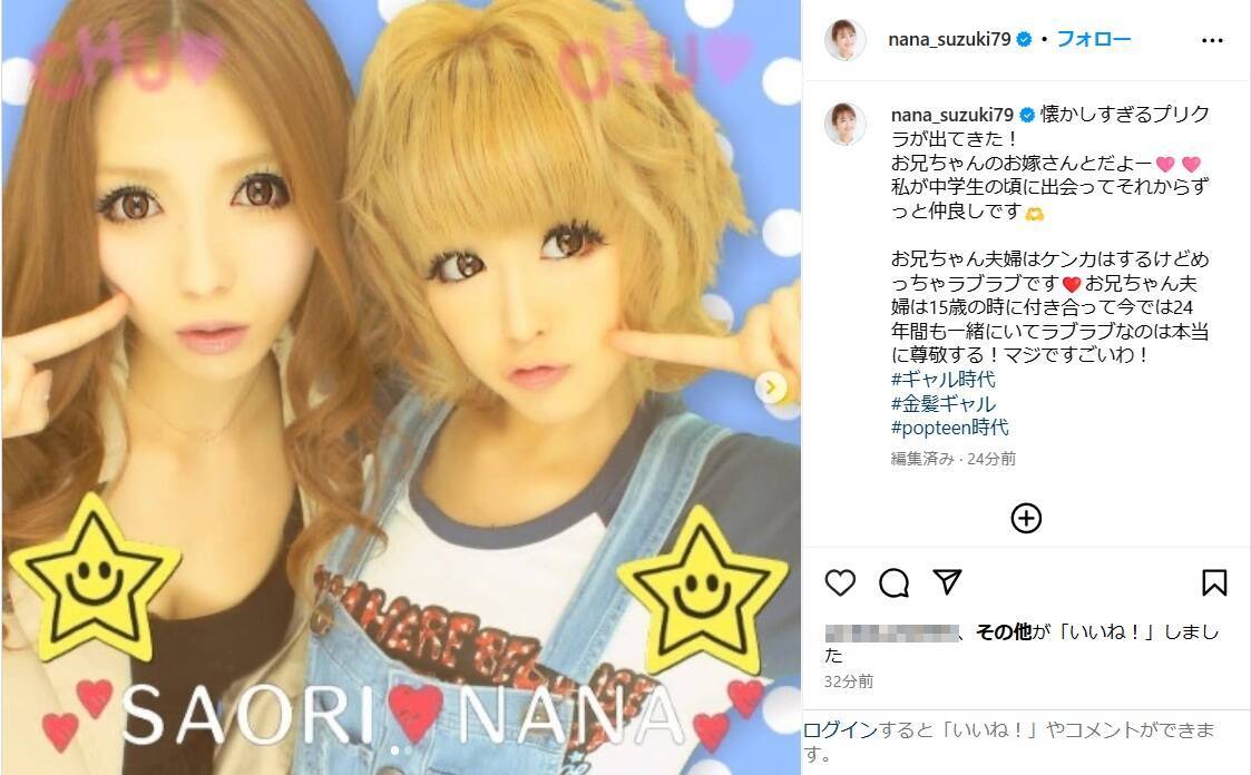 鈴木は「懐かしすぎるプリクラが出てきた!お兄ちゃんのお嫁さんとだよー 私が中学生の頃に出会ってそれからずっと仲良しです」と記し、写真を投稿。金髪にギャルメイクの鈴木と、義理の姉と仲良く同じポーズで写るプリクラを披露し、「お兄ちゃん夫婦はケンカはするけどめっちゃラブラブです お兄ちゃん夫婦は15歳の時に付き合って今では24年間も一緒にいてラブラブなのは本当に尊敬する!マジですごいわ!」とつづった。