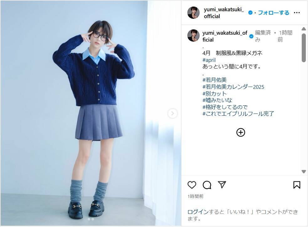 若月は「4月 制服風黒縁メガネ #april あっという間に4月です」とつづり、写真を投稿。黒縁メガネをかけて、シャツにカーディガンとミニスカート、ローファーを履いて制服風コーデを披露した。