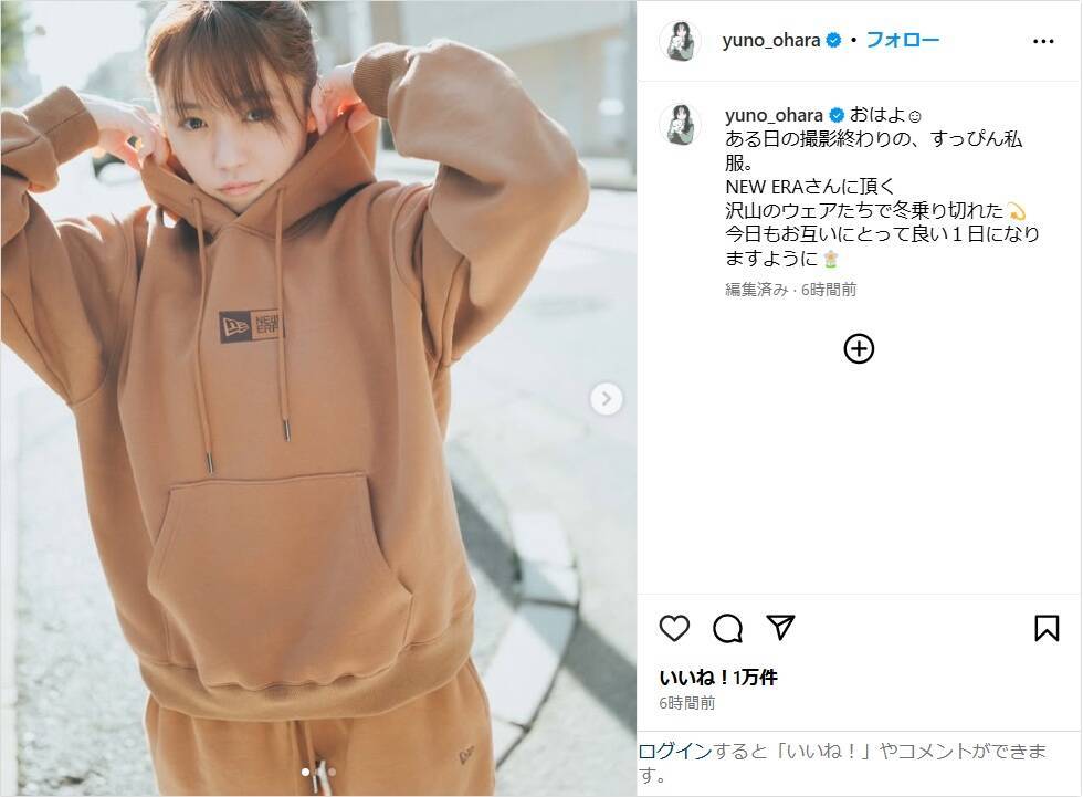 大原は「おはよ ある日の撮影終わりの、すっぴん私服 NEW ERAさんに頂く」と記し、写真を投稿。お団子ヘアにすっぴん姿で、ブラウンのスウェットのセットアップを着た私服ショットを披露し、「沢山のウェアたちで冬乗り切れた 今日もお互いにとって良い1日になりますように」とつづった。