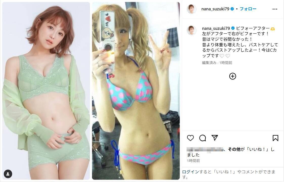 タレントの鈴木奈々が18日、自身のインスタグラムを更新。バストアップしたビフォーアフター写真を公開した。
