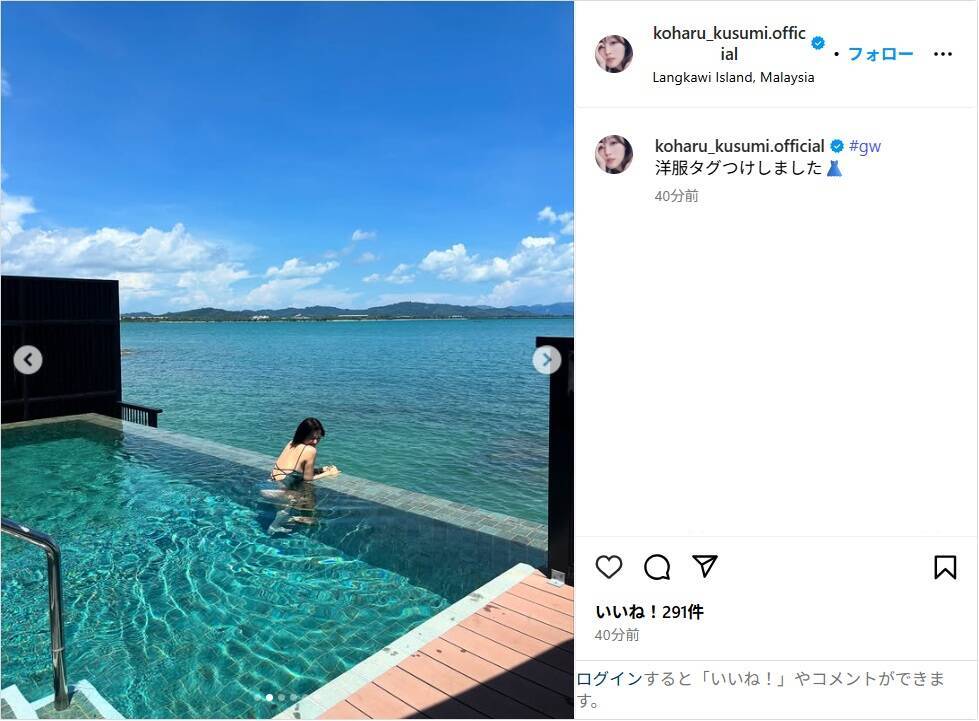久住は位置情報をマレーシアのランカウィ島とし、「#gw 洋服タグつけしました」とつづり、写真を投稿。水着姿でプールを楽しむ写真や、綺麗な海や美味しそうなご飯を満喫する姿を披露した。
