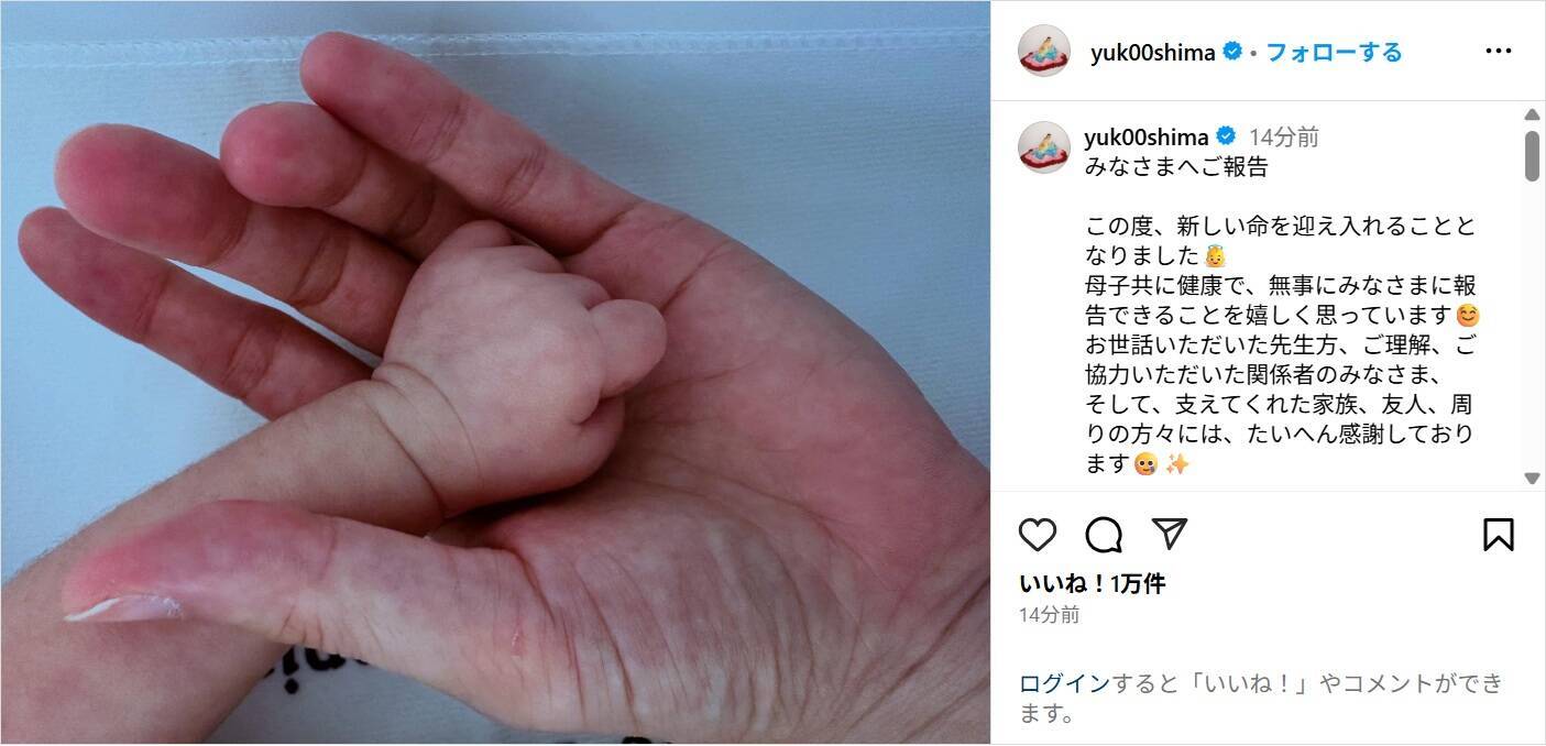 大島は「みなさまへご報告 この度、新しい命を迎え入れることとなりました」と報告し、赤ちゃんの手を優しく握る写真を投稿。「母子共に健康で、無事にみなさまに報告できることを嬉しく思っています」と伝え、「お世話いただいた先生方、ご理解、ご協力いただいた関係者のみなさま、そして、支えてくれた家族、友人、周りの方々には、たいへん感謝しております」と感謝し、「これから子供たちと育んでいく未来が楽しみでなりません またみなさまにお会いできる日まで温かく見守っていただけると幸いです」と呼びかけた。