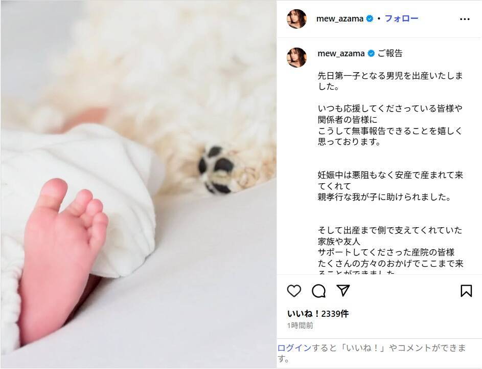 モデルの安座間美優が24日、自身のインスタグラムを更新。第1子となる男児を出産したことを報告した。