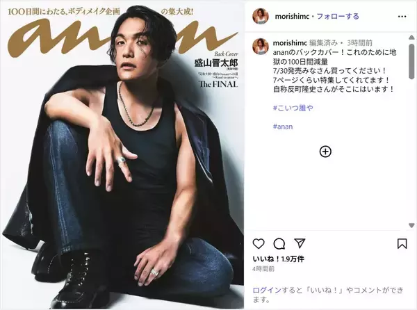 盛山は「ananのバックカバー!これのために地獄の100日間減量 7/30発売みなさん買ってください!」と30日発売の雑誌『anan』のバックカバーを飾ることを報告し、写真を投稿。レザージャケットを肩にかけ、黒のタンクトップにデニム姿で、クールな表情を見せるカットを披露し、「7ページくらい特集してくれてます!自称反町隆史さんがそこにはいます!」とつづった。