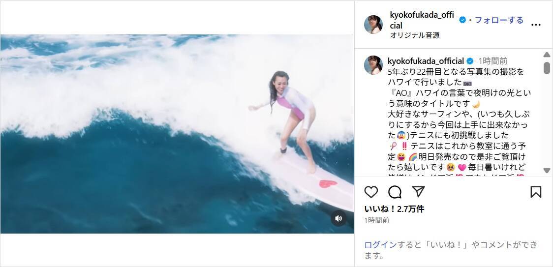 この投稿にファンからは、「待ってました~~」「サーフィンかっこいい」「波乗りキョンちゃん可愛い」「人魚姫のようだ」「写真集楽しみにしています」などのコメントが寄せられている。