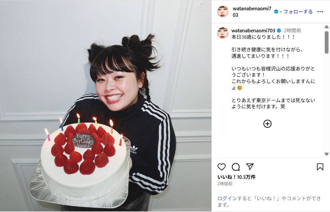 渡辺は「本日38歳になりました!!!」と報告し、笑顔でバースデーケーキを持った写真を投稿。続けて「引き続き健康に気を付けながら、邁進してまいります!!!」と意気込み、「いつもいつも皆様沢山の応援ありがとうございます!これからもよろしくお願いしますんにょ とりあえず東京ドームまでは死なないように気を付けます。笑」とユーモアを交えてつづった。