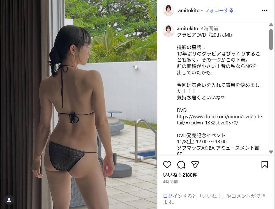 今年デビュー20周年を迎え、10月31日にグラビアDVD「20th aMI」を発売した時東。この日、「この撮影の裏話…10年ぶりのグラビアはびっくりすることも多く。その一つがこの下着。前の面積が小さい!昔の私ならNGを出していたかも…」と明かし、水着姿で佇むバックショットを披露。続けて「今回は気合いを入れて着用を決めました!!!気持ち届くといいな」とつづった。