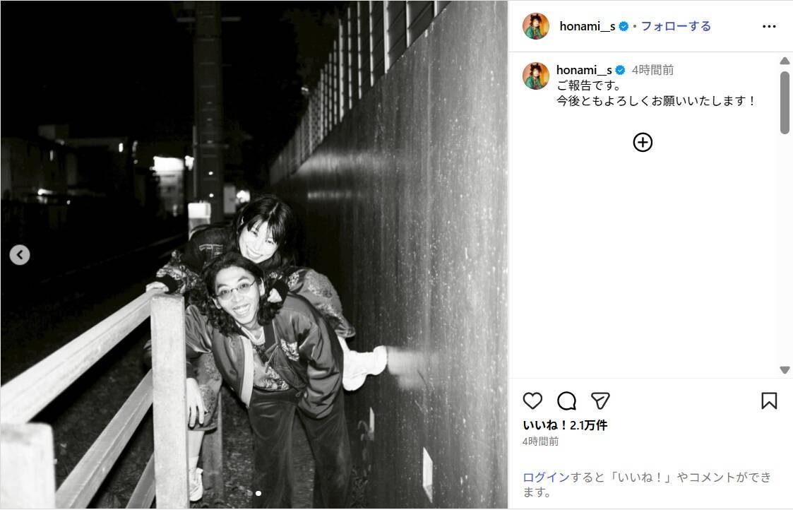 さとうは「ご報告です。今後ともよろしくお願いいたします!」とつづり、2人の直筆署名入りの文書を投稿。「私事ではございますが、柄本時生とさとうほなみは本日、十一月十三日に入籍いたしましたことをご報告いたします」と報告し、「これからも感謝と初心を忘れずふたりで歩んで参ります」とし「今後ともご指導ご鞭撻のほど、何卒よろしく申し上げます」と呼びかけた。2枚目の投稿には、仲睦まじい様子で笑顔を見せるモノクロの2ショットがおさめられている。