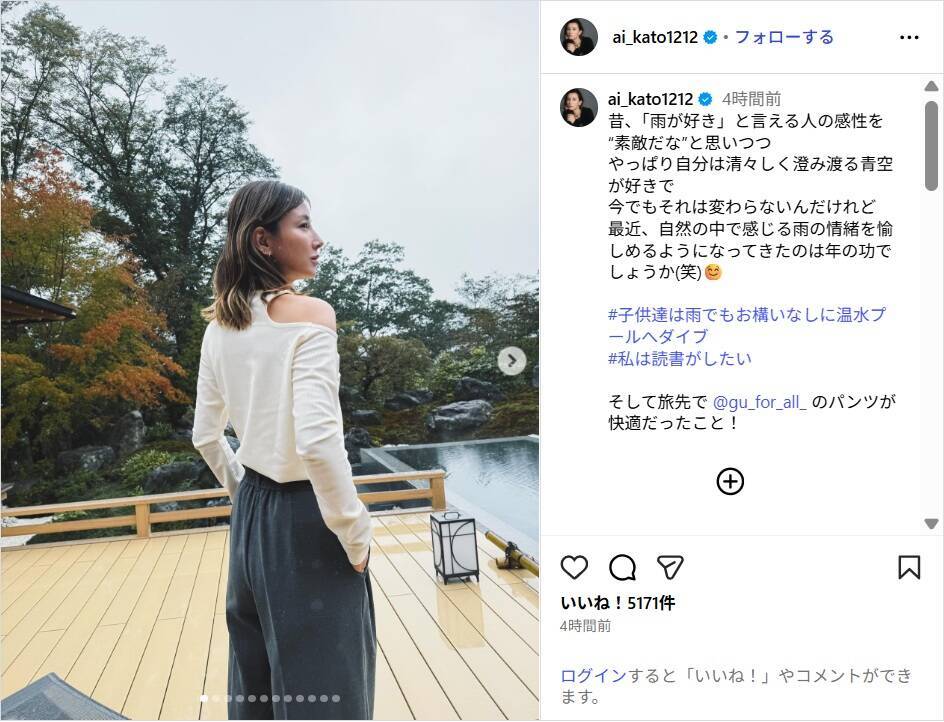 加藤は「昔、『雨が好き』と言える人の感性を“素敵だな”と思いつつ やっぱり自分は清々しく澄み渡る青空が好きで 今でもそれは変わらないんだけれど 最近、自然の中で感じる雨の情緒を愉しめるようになってきたのは年の功でしょうか(笑)」と記し、写真を投稿。白の肩出しトップスにダークカラーのパンツ、スニーカーの旅コーデを披露し、「#子供達は雨でもお構いなしに温水プールへダイブ #私は読書がしたい」とハッシュタグを添え、旅先で着用したパンツが快適だったこともつづった。