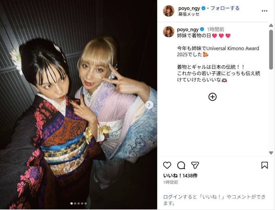 ゆきぽよは「姉妹で着物の日」と記し、写真を投稿。ゆきぽよは黒や赤の着物姿、ゆみちぃはピンクや水色の着物姿で、2人並んでポーズを決める姉妹ショットを披露し、「今年も姉妹でUniversal Kimono Award 2025でした 着物とギャルは日本の伝統!!これからの若い子達にどっちも伝え続けていけたらいいな」とつづった。
