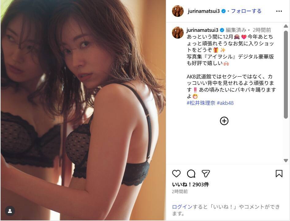 松井は「あっという間に12月 今年あとちょっと頑張れそうなお気に入りショットをどうぞ 写真集『アイヲシル』デジタル豪華版も好評で嬉しい」と記し、写真を投稿。黒のランジェリー姿でカメラを見つめるショットを披露し、「AKB武道館ではセクシーではなく、カッコいい背中を見せれるよう頑張ります あの頃みたいにバキバキ踊りますよ」とつづった。
