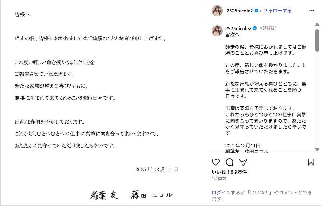 この投稿にファンからは、「にこるん!本当におめでとう」「幸せな報告ありがとう」「元気な赤ちゃんが産まれますように」「お身体大切にお過ごしくださいね」などのコメントが寄せられている。