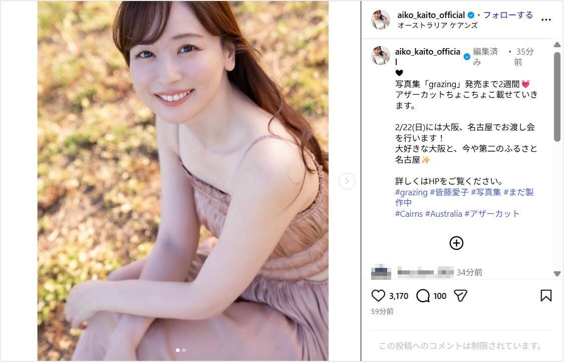 皆藤は「写真集『grazing』発売まで2週間 アザーカットちょこちょこ載せていきます」と記し、写真を投稿。キャミワンピース姿で、笑顔でカメラを見つめるショットを披露し、「2/22(日)には大阪、名古屋でお渡し会を行います!大好きな大阪と、今や第二のふるさと名古屋 詳しくはHPをご覧ください」と呼びかけた。