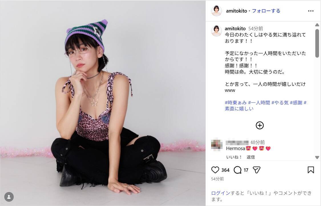 時東は「今日のわたくしはやる気に満ち溢れております!!」と書き出し、写真を投稿。猫耳ニット帽をかぶり、トレードマークの眼鏡をかけて、ヒョウ柄のキャミソールを着た肌見せスタイルのショットを披露し、「予定になかった一人時間をいただいたからです!!感謝!感謝!!時間は命。大切に使うのだ。とか言って、一人の時間が嬉しいだけwww」とつづった。