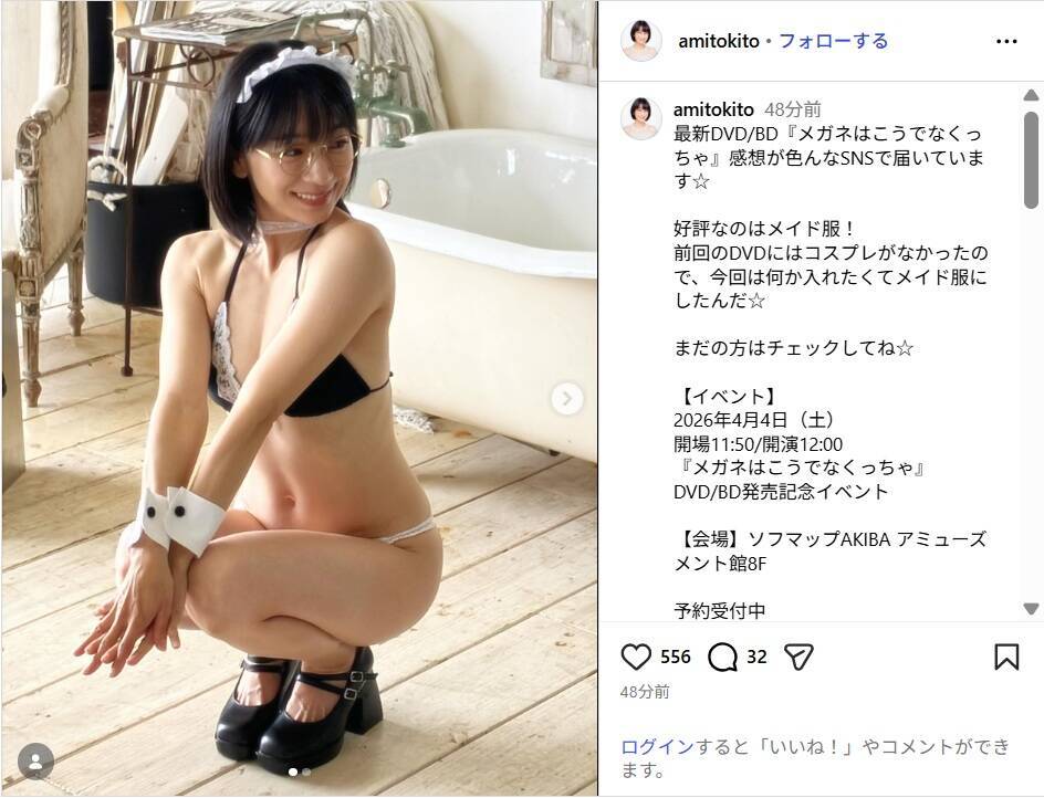 時東は「最新DVD/BD『メガネはこうでなくっちゃ』感想が色んなSNSで届いています 好評なのはメイド服!前回のDVDにはコスプレがなかったので、今回は何か入れたくてメイド服にしたんだ」と記し、写真を投稿。トレードマークの眼鏡をかけて、フリルカチューシャやカフス、黒のランジェリーをまとったメイドコスプレ姿を披露した。