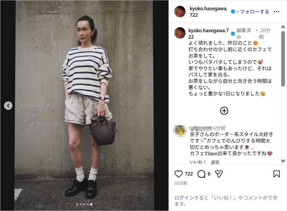 長谷川は「よく晴れました、昨日のこと」と書き出し、写真を投稿。髪をポニーテールにして、ボーダーのトップスにショートパンツ、黒の靴の組み合わせで美脚が際立つコーディネートを披露し、「打ち合わせの少し前に近くのカフェでお茶をして。いつもバタバタしてしまうので 家でやりたい事もあったけど、それはパスして家を出る。お茶をしながら自分と向き合う時間は悪くない。ちょっと豊かな1日になりました」とつづった。