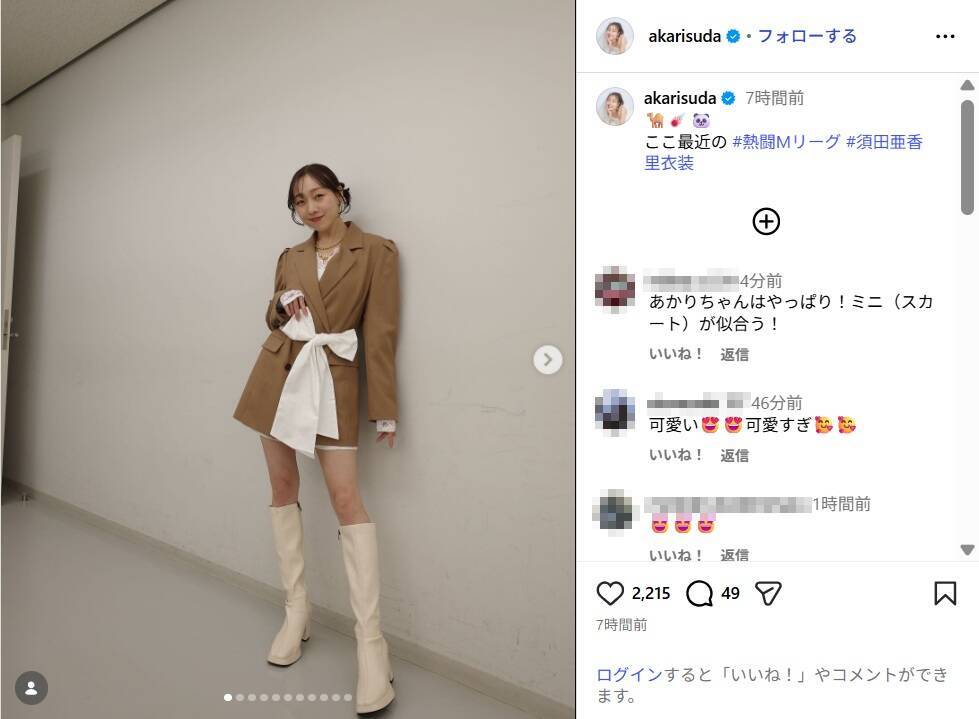この投稿にファンからは、「どの衣装も似合ってて可愛い」「コーデ素敵ですよ」「相変わらずスタイル抜群ですね」「何を着ても、あかりんはかわいい」など絶賛の声が寄せられている。