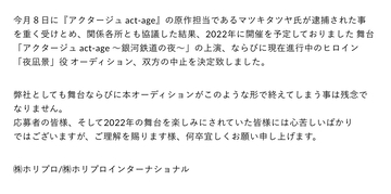 舞台『アクタージュ』上演およびヒロイン・夜凪景役オーディション中止を発表 原作担当・マツキ氏の逮捕を受け