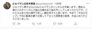 8月3日(火)、ジョイマン・高木がTwitterを更新。ジョイマンのYouTubeチャンネルについてある報告をしたところ、ファンから大きな反響が寄せられています。 突然の報告も…“韻踏み”コメント殺到...
