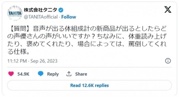株式会社タニタの公式エックスが26日に更新。フォロワーへ新商品についての質問を投げかけると、多くの返信やリポストが集まっている。タニタは「【質問】音声が出る体組成計の新商品が出るとしたらどの声優さんの...