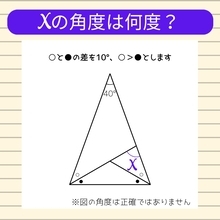 全3問!図中の「x」の角度は何度でしょう?●第1問※図に記載されている角度は、実際の角度とは異なります正解は……↓↓↓↓↓↓↓↓↓正解は40°でした!●第2問※図に記載されている角度は、実際の角度とは...
